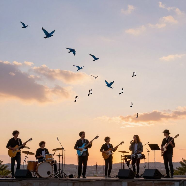 Photograph of a sunset silhouette band with five musicians, birds flying above, musical notes floating, and a vibrant sky.