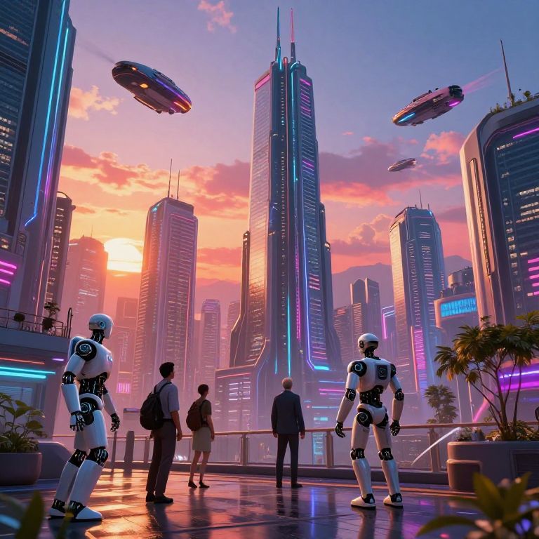 AI sci fi art depicting a futuristic cityscape with towering neon-lit skyscrapers, flying vehicles, and humanoid robots interacting seamlessly with humans, under a vibrant sunset sky, in a hyper-detailed, cyberpunk style.