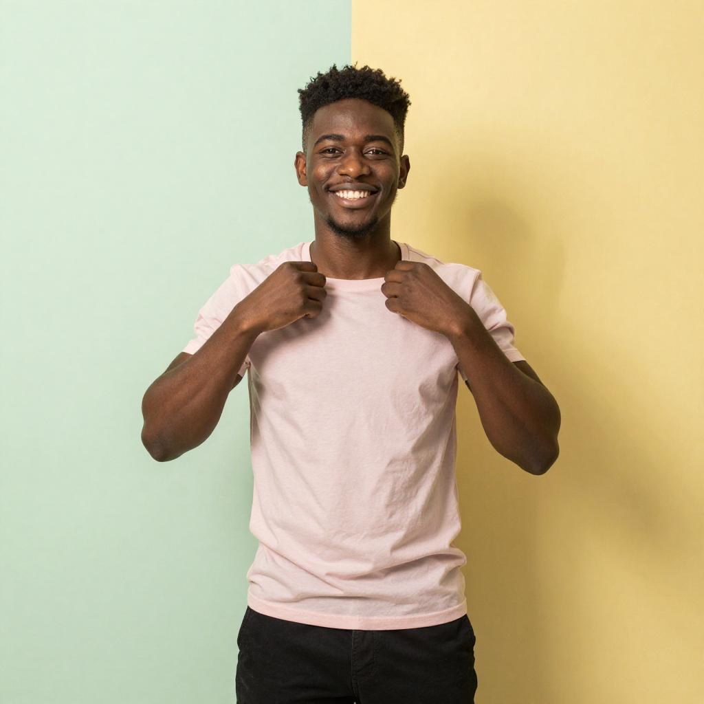 Photograph of a young Black man with short, curly hair, smiling broadly while adjusting his pink t-shirt. He's standing against a two-toned wall, half pastel green and half bright yellow, casting a shadow on the yellow side. He's wearing dark pants and has a relaxed, confident posture. The lighting is natural, highlighting his cheerful expression and the vibrant colors of the background.