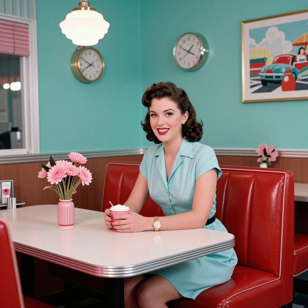 A vibrant retro diner scene featuring a woman seated at a table adorned with pink flowers, captured in a high-definition, vintage Americana style reminiscent of 1950s photography by Paul Ward, with bold red leather booths, teal walls, and nostalgic decor including a clock and framed artwork.