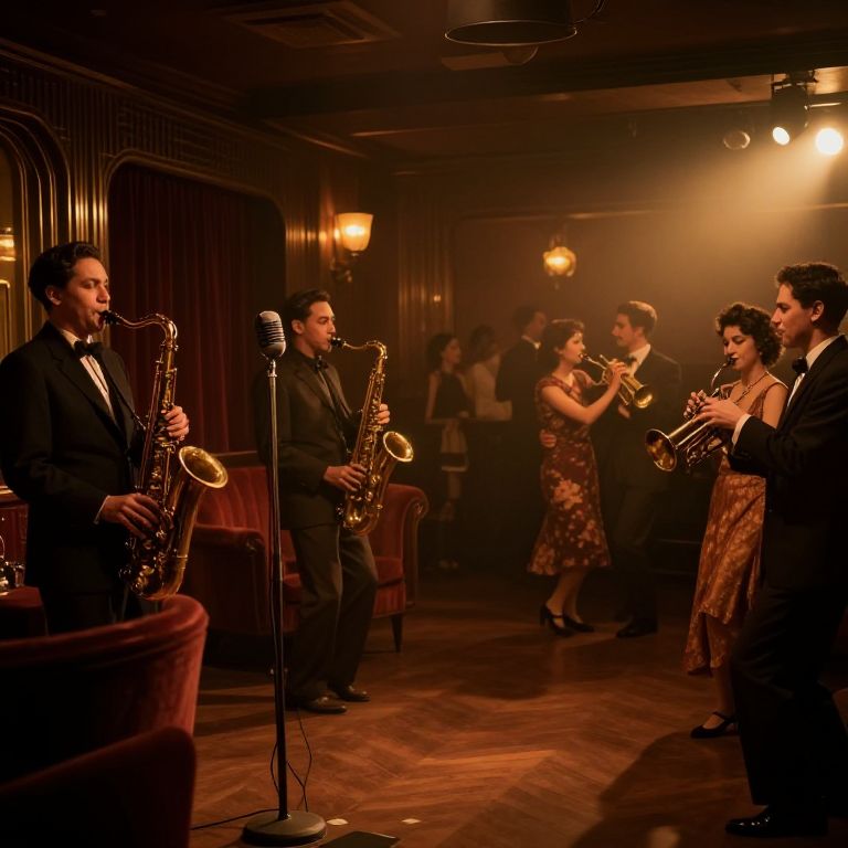 1931 jazz club interior, dimly lit room with vintage microphones, musicians playing saxophone and trumpet, patrons in 1930s style clothing enjoying music and dancing, rich warm tones, smoky ambiance, art deco furniture and decor