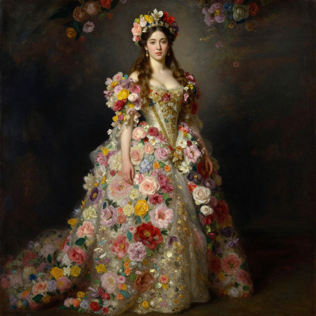 Photorealistic painting of a woman in an elaborate, flower-adorned gown with a floral crown, standing against a dark, textured background.