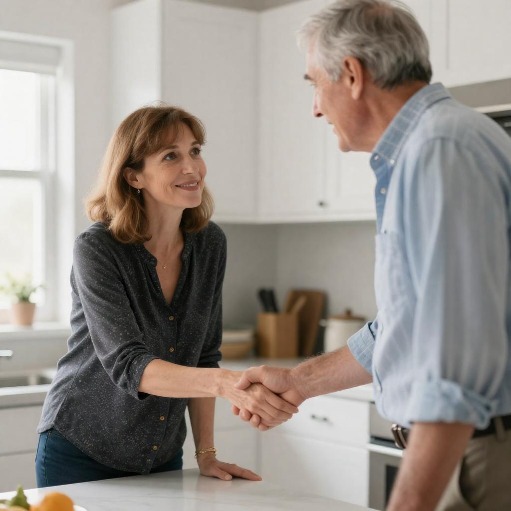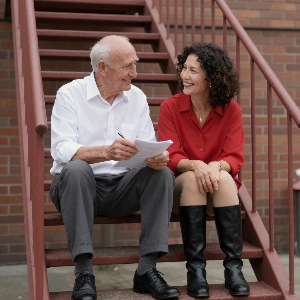 Photograph of an older man and woman sitting on a red metal staircase. The man, with bald head and white shirt, holds a pen and paper, smiling. The woman, with curly dark hair and red blouse, smiles back. Both wear black knee-high boots. Brick walls and metal railings frame the background.