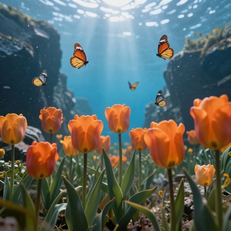 A surreal underwater meadow bursts with vibrant orange tulips, where butterflies gracefully float among rocky cliffs and ethereal light filters through the tranquil blue depths.