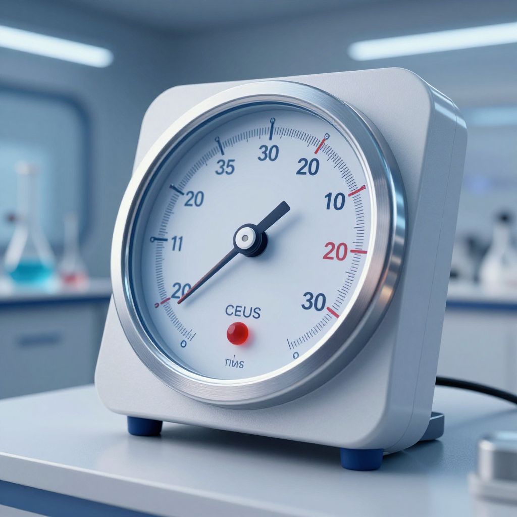 Celsius concept visualized as an elegant scientific instrument in a futuristic laboratory, digital display showing temperature readings, sleek metallic textures, blue and white color palette, hyper-realistic style