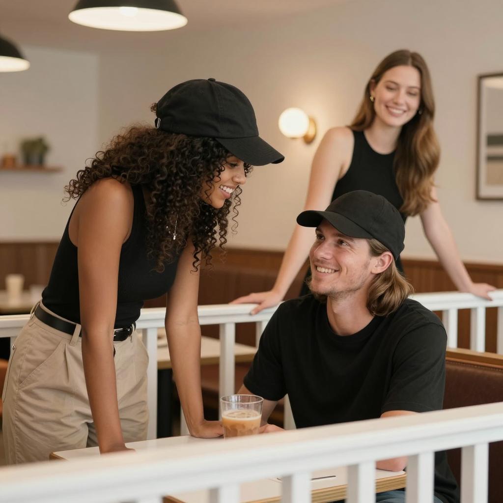 Two men engaged in conversation while holding takeaway coffee cups in a busy cafe. One man has light brown hair and wears a blue patterned shirt over a black t-shirt, the other is bald and wears a white shirt with a beige vest. The background shows a diverse group of casually dressed people in a sunlit cafe setting.
