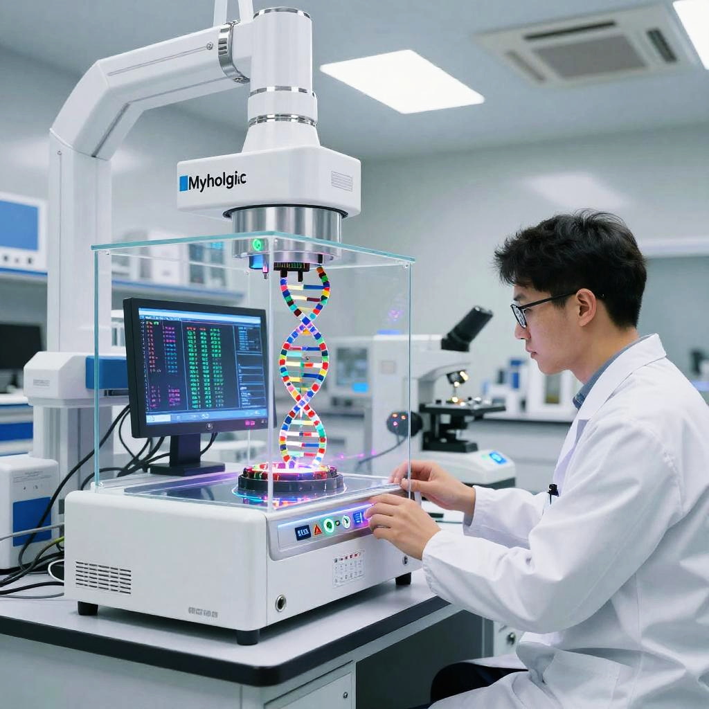Myhologic biotech laboratory, scientists working with advanced genetic equipment, transparent screens displaying DNA sequences, chrome and glass surfaces, bright sterile lighting, futuristic medical technology vibe, photorealistic style with intricate details.