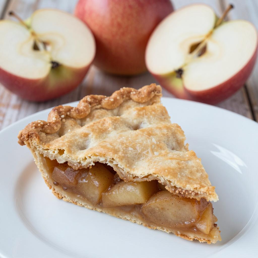 Close-up image of a slice of homemade apple pie with a golden, flaky crust and cinnamon-spiced apple filling. The pie slice is served on a white plate, with whole and sliced apples in the background on a rustic wooden surface, captured in natural morning light with a soft brightness boost and shallow depth of field.