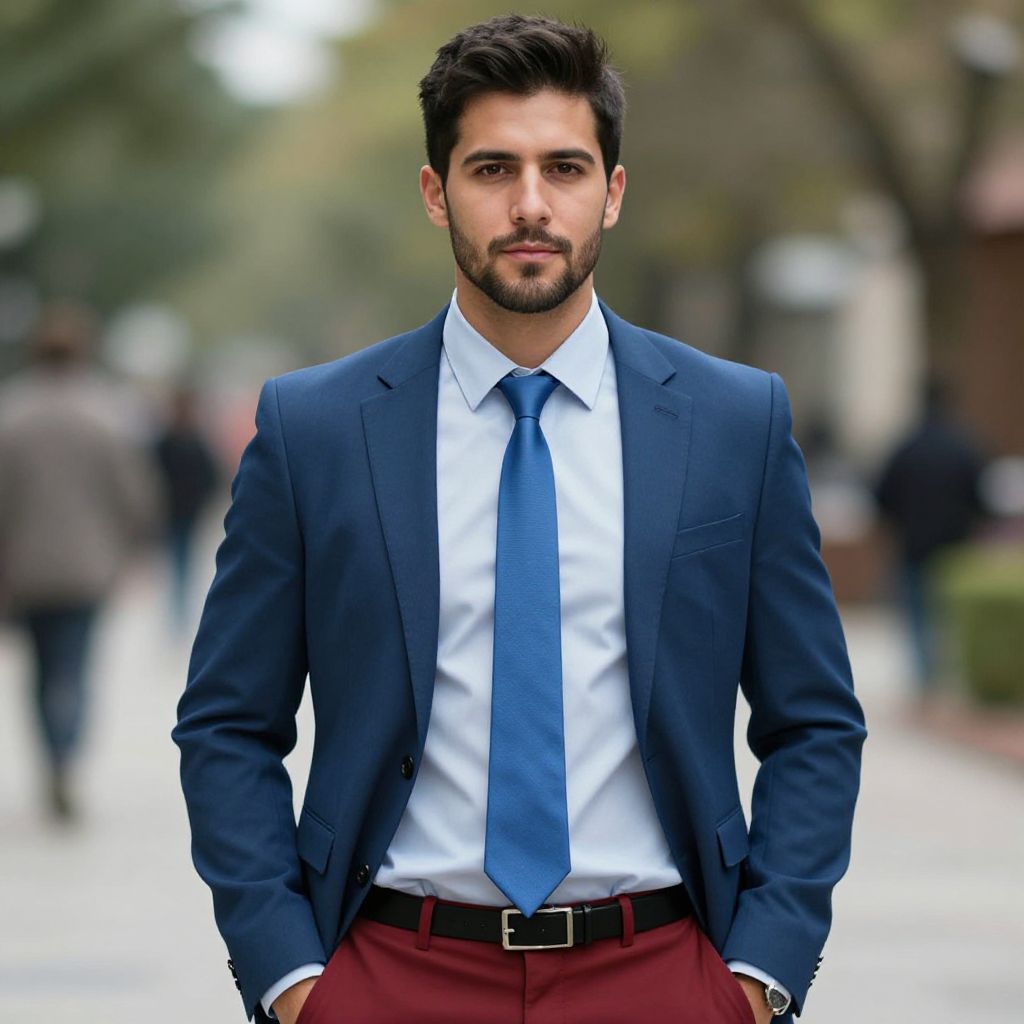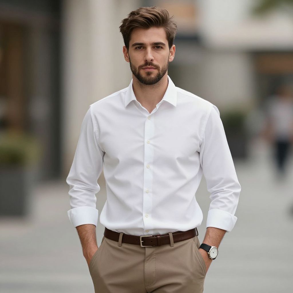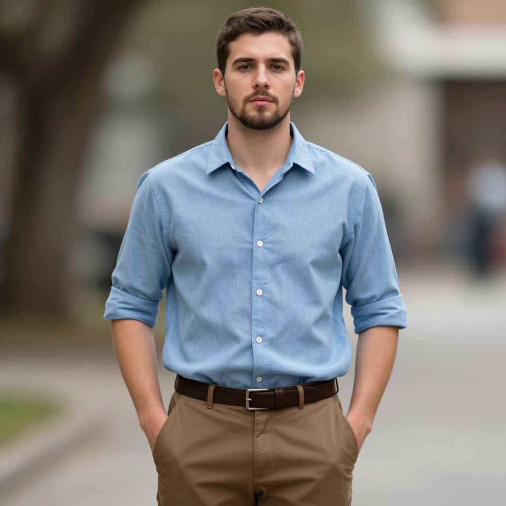 Photograph of a handsome young man with fair skin and dark brown hair, styled neatly with a trimmed beard. He wears a light blue, button-up, long-sleeve shirt with sleeves rolled to his elbows, and brown pants with a black belt. His hands are in his pants pockets. He stands on a blurred street with trees and buildings in the background. The lighting is natural, and his expression is serious and confident. The image has a shallow depth of field, focusing sharply on the man while the background is softly out of focus.