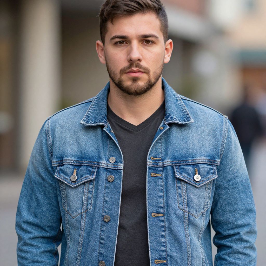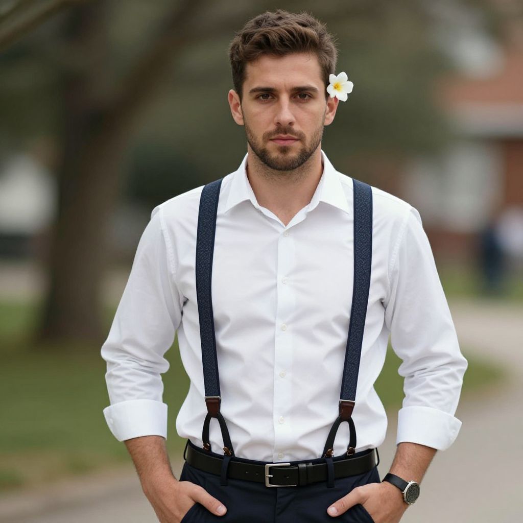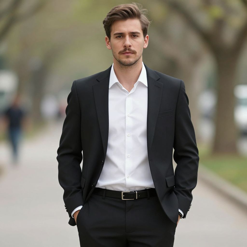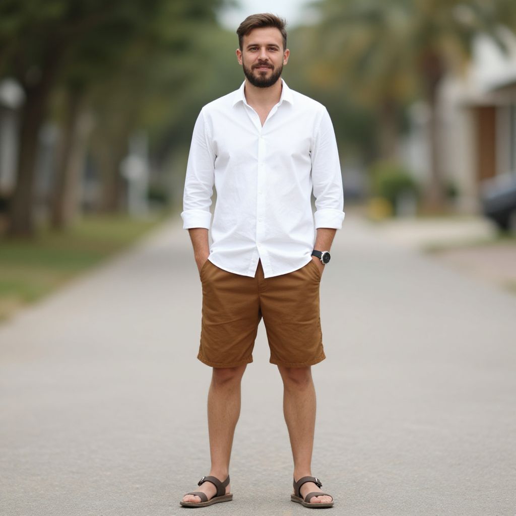 Photograph of a handsome young man with fair skin and dark brown hair, styled neatly with a trimmed beard. He wears a light blue, button-up, long-sleeve shirt with sleeves rolled to his elbows, and brown pants with a black belt. His hands are in his pants pockets. He stands on a blurred street with trees and buildings in the background. The lighting is natural, and his expression is serious and confident. The image has a shallow depth of field, focusing sharply on the man while the background is softly out of focus.