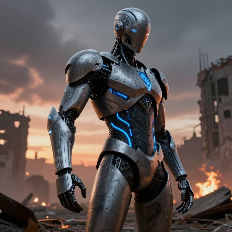 Automail arm integrated seamlessly into a warrior's body armor, featuring intricate engravings and glowing blue energy conduits, standing in a post-apocalyptic battlefield with ruined buildings and burning horizon in the background.