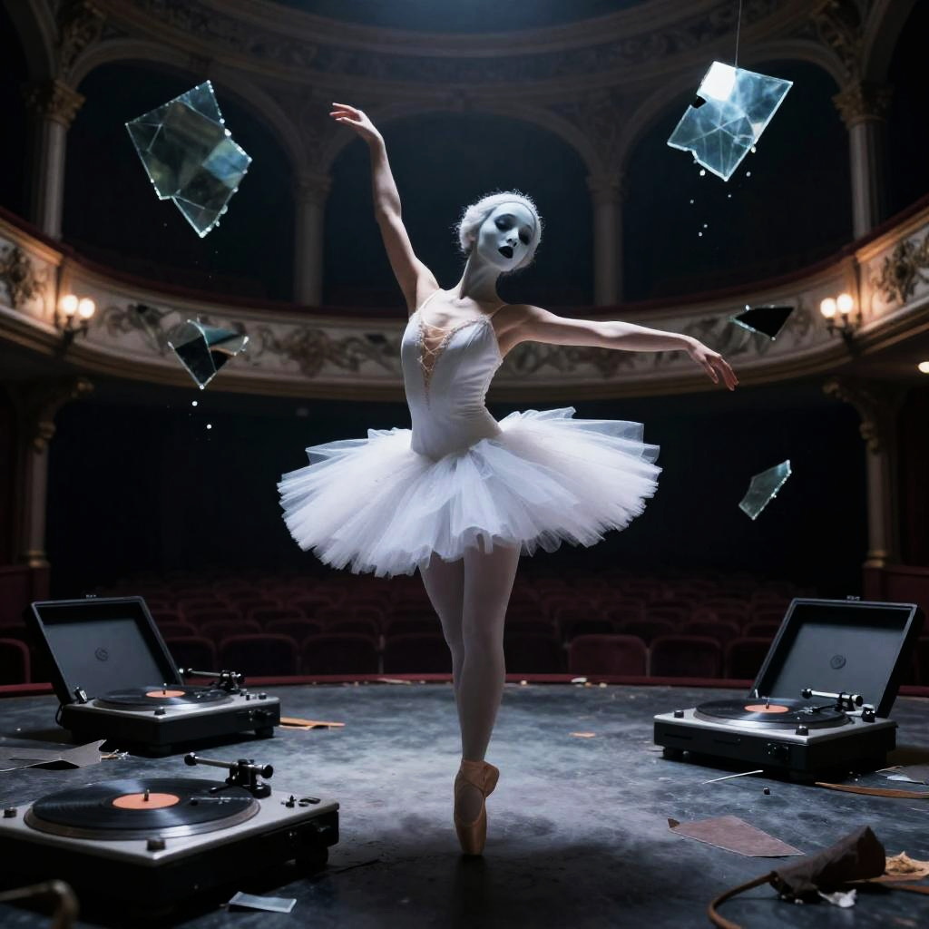 Realistic photo.Whimsical art style inspired by Tim Burton, Edward Gorey depicting a ghostly ballerina performing in a crumbling theater, with broken mirrors, eerie turntables adding an air of unsettling charm. realistic photo