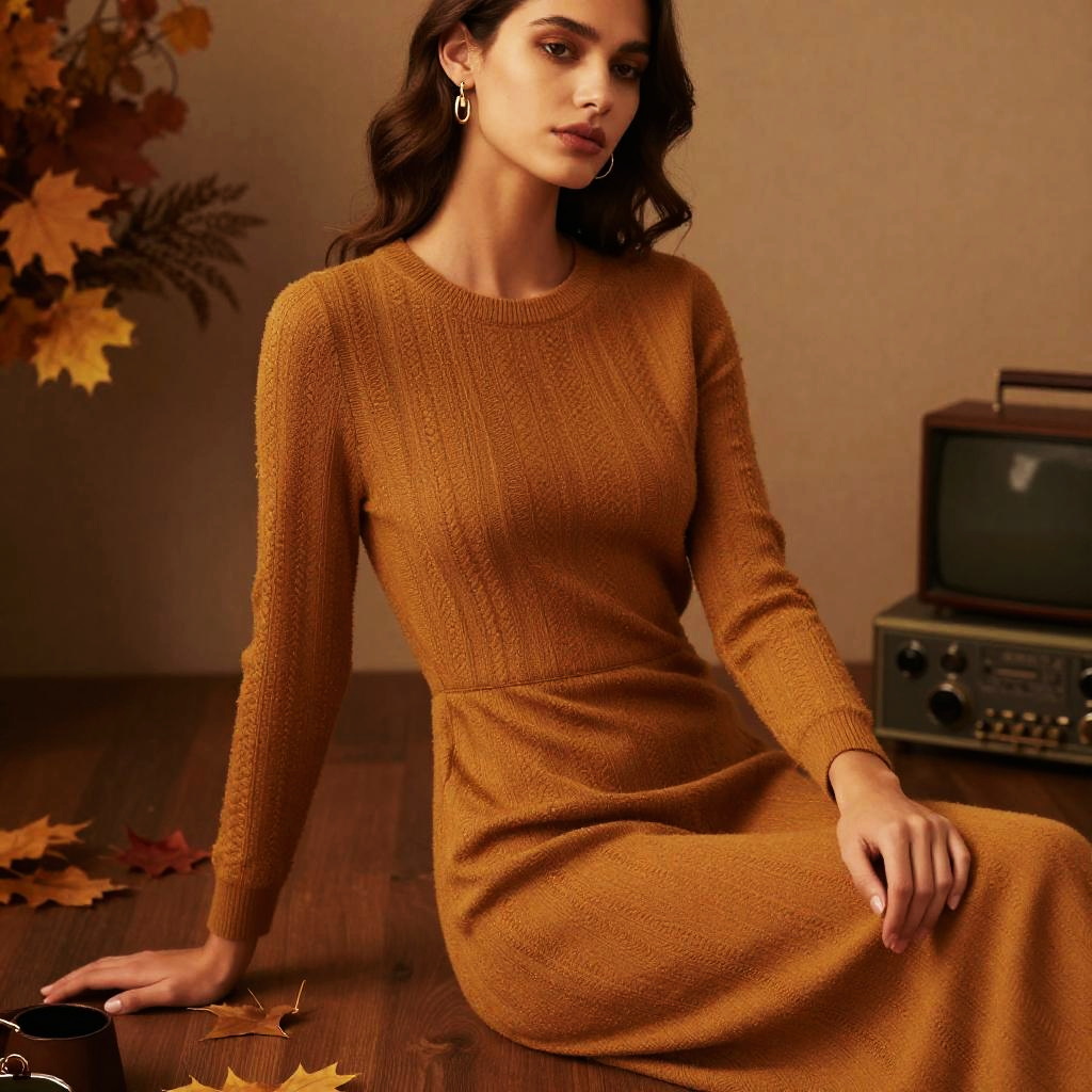 A warmcore fashion shoot with a model dressed in caramel and burnt sienna hues, surrounded by warm ambient light, autumnal foliage, soft fabric textures, vintage accessories, and a serene expression, blending warmth and understated style.