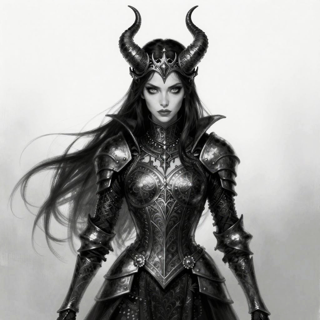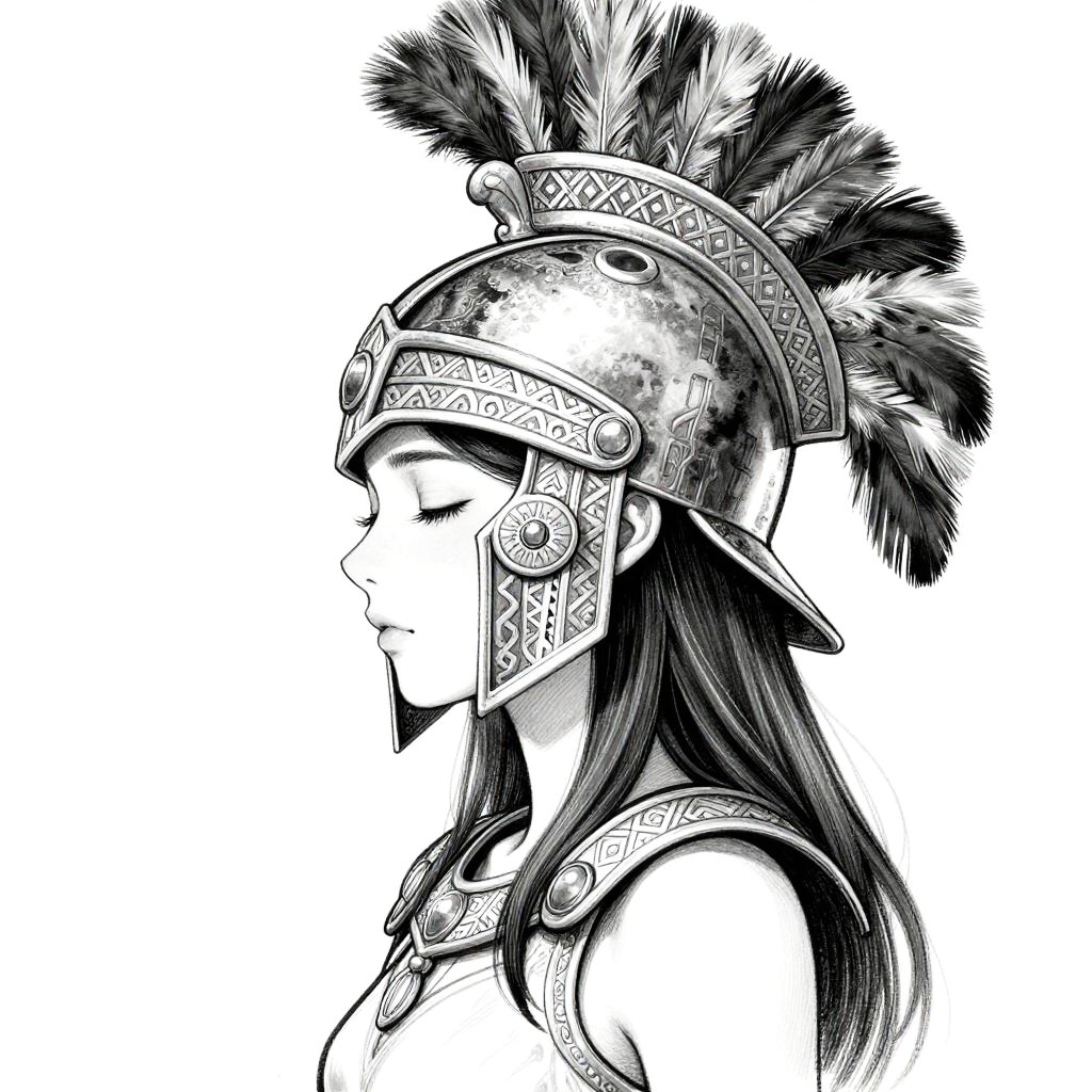 Black and white digital drawing of a side profile of a young woman with closed eyes, wearing an elaborate ancient warrior helmet adorned with intricate patterns and a tall feather plume. She has long, straight, dark hair flowing down her back and wears a detailed shoulder armor. Her skin tone is not visible due to the monochrome style. The background is plain white, highlighting the detailed, textured elements of her helmet and armor. The drawing has a strong, clean, and precise line art style.