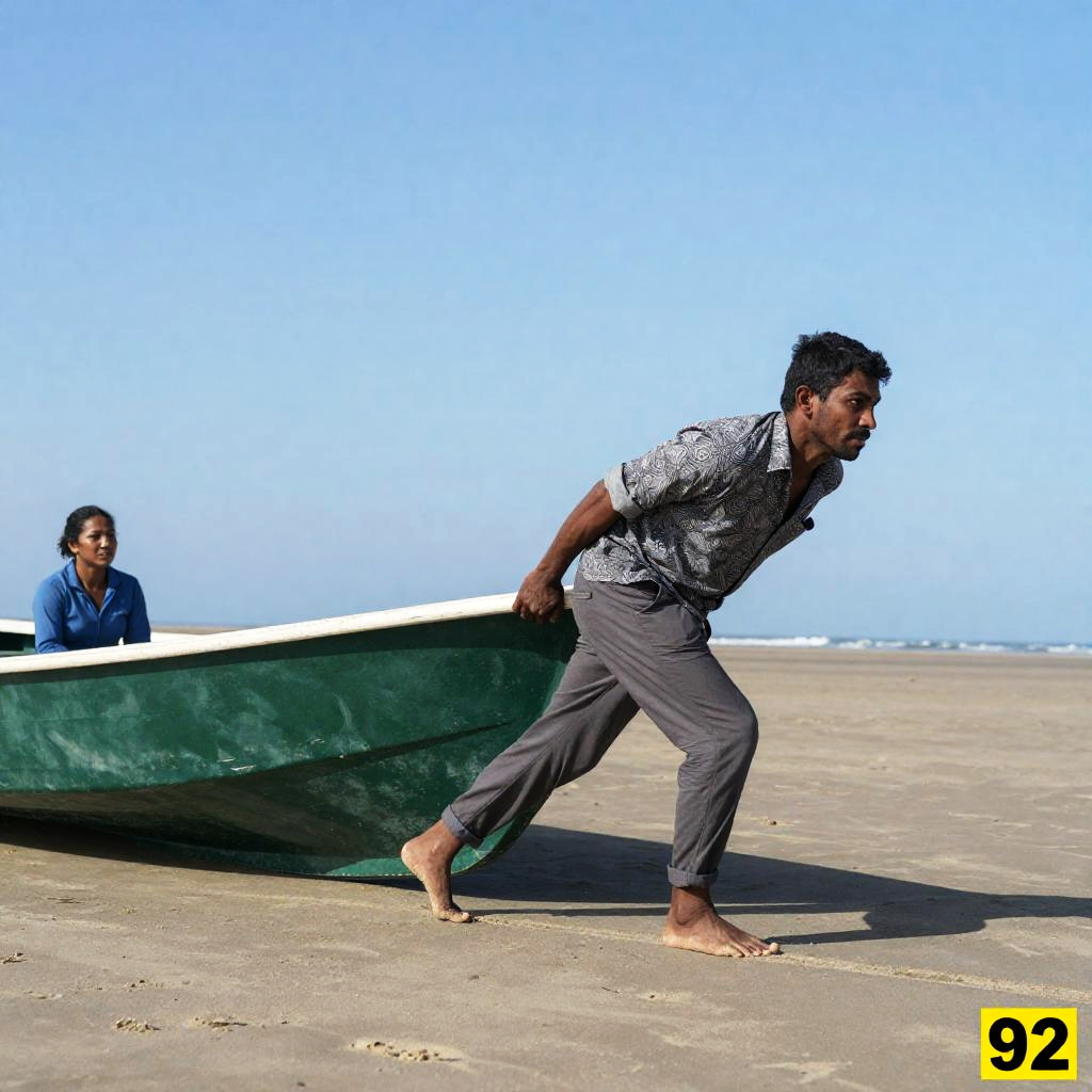 Photograph of a barefoot South Asian man dressed in a patterned shirt and rolled-up gray pants pulling a small green boat on a wide sandy beach. A South Asian woman wearing a blue long-sleeve shirt is sitting inside the boat. The background features a clear blue sky and a distant view of the ocean waves.