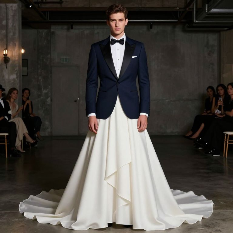 Photograph of a young Caucasian man with short, dark brown hair, standing confidently on a dimly-lit runway. He is wearing a black tuxedo jacket with a white shirt, black bow tie, and a long, white, A-line wedding-style skirt that flows to the ground and extends slightly behind him. The background is an industrial-style room with concrete walls, exposed pipes, and dim lighting. Several seated, elegantly dressed women are visible in the background, watching the runway. The image has a fashion show atmosphere, with a focus on formal, traditional attire.