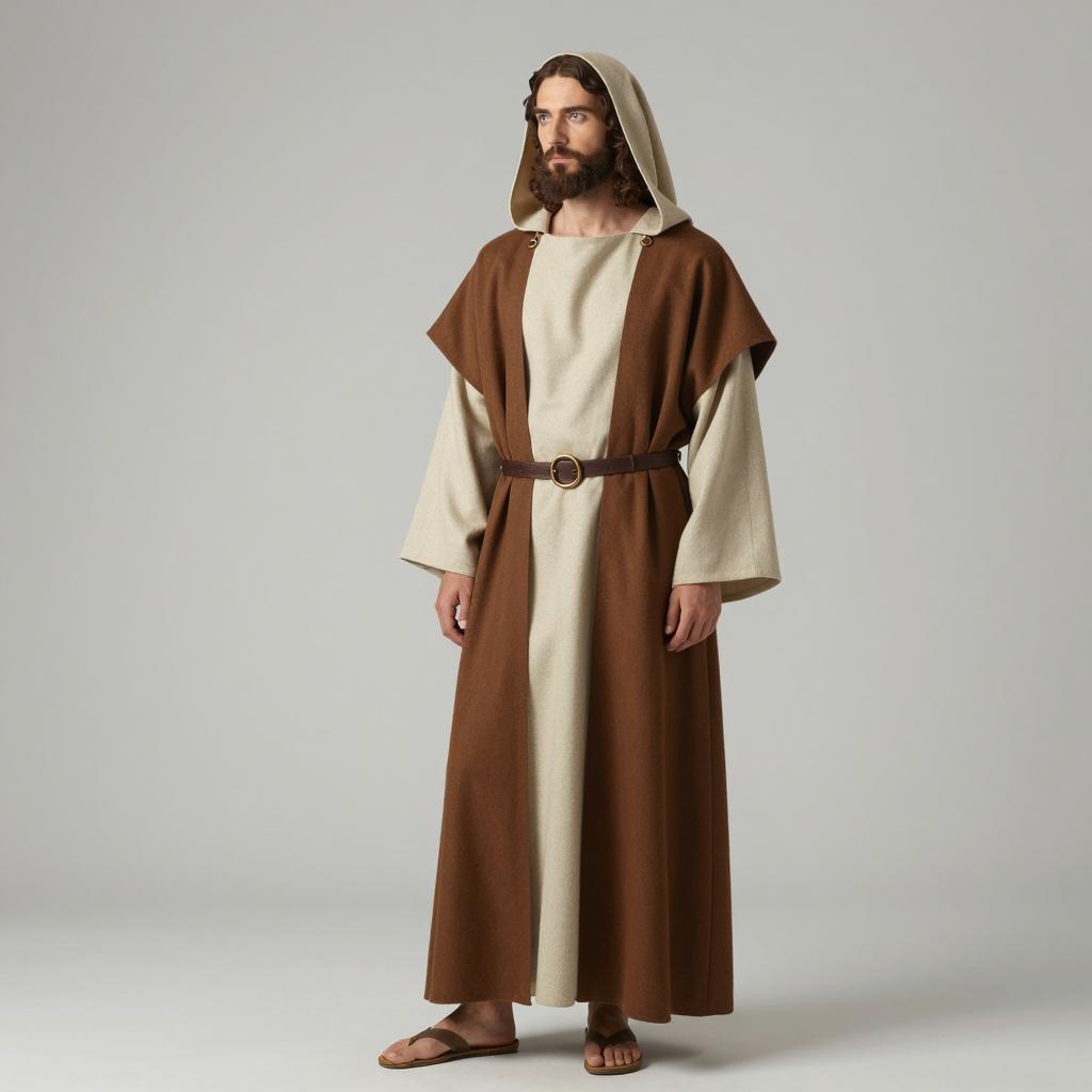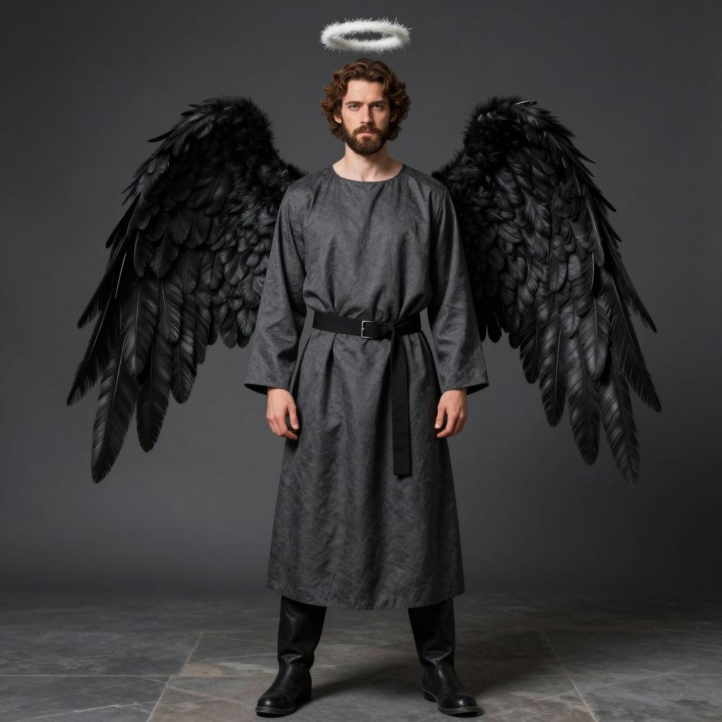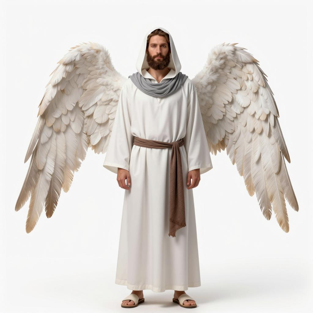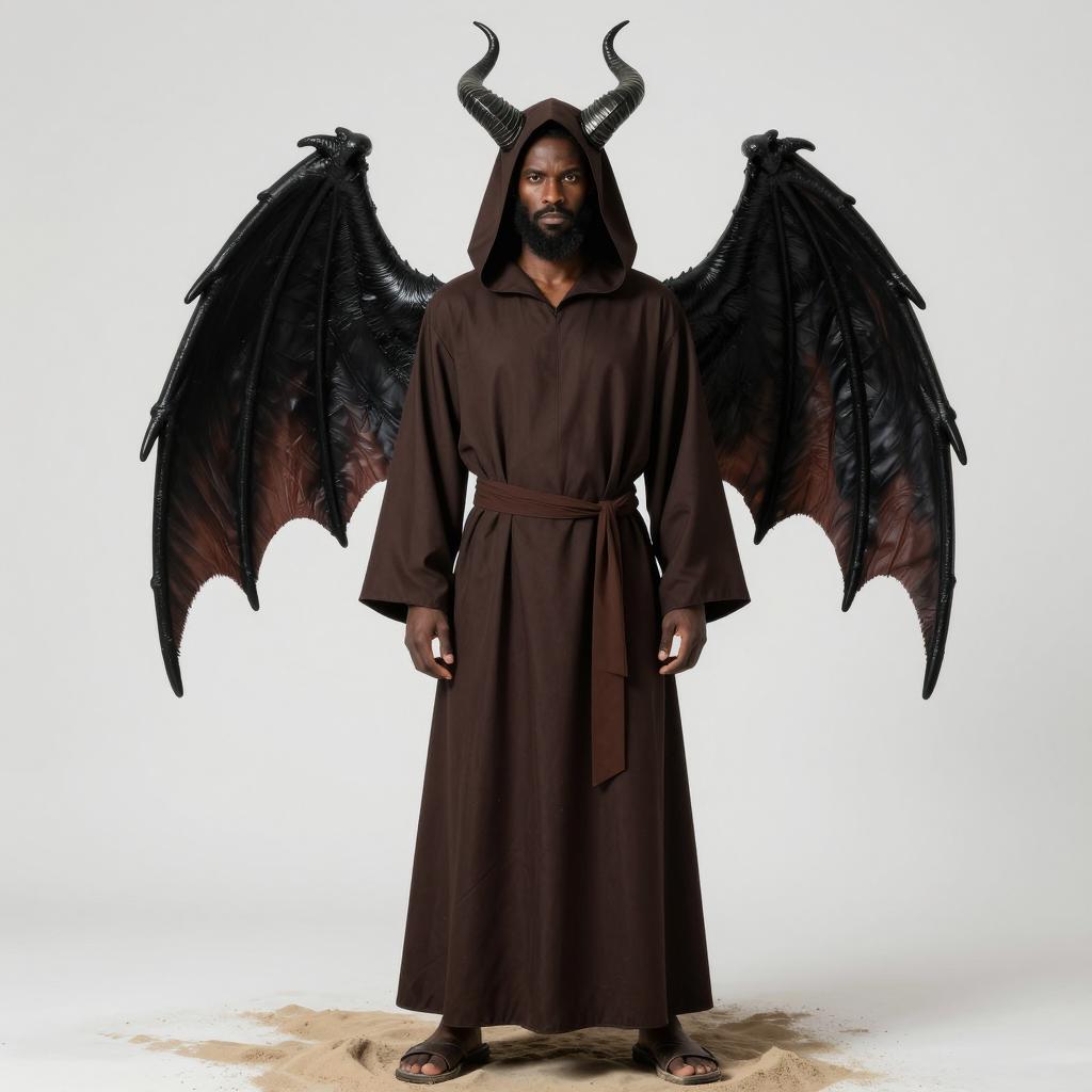 Lucifer sandman costume, photorealistic, full-body, male, dark-skinned, hooded robe, long brown tunic, brown sash, sandals, black demon wings, black horns, beard, serious expression, standing, plain white background, sand at feet, fantasy, dark fantasy, digital art, tall and imposing, neutral lighting
