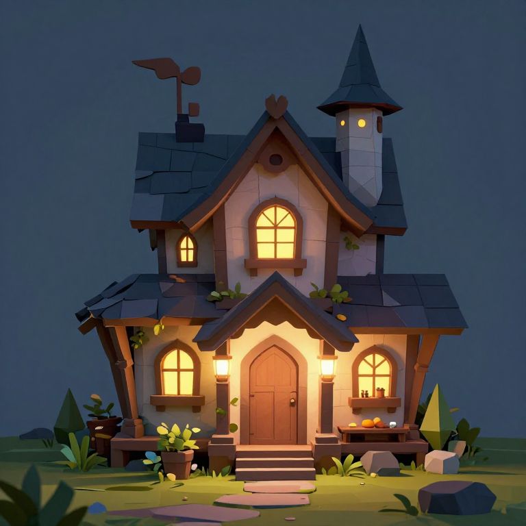Burst Mode low poly, concept art, inside of beautiful light peacful witches cottage, art station, fantasy,