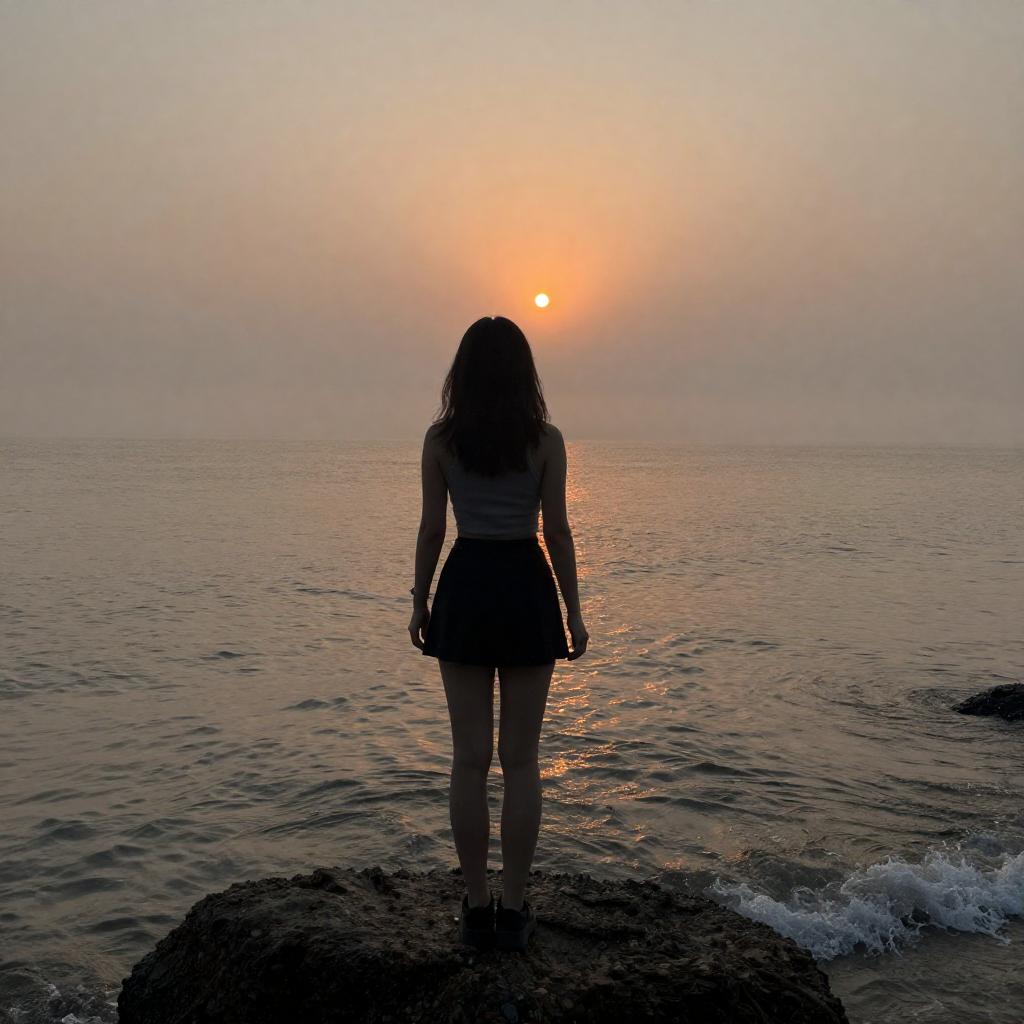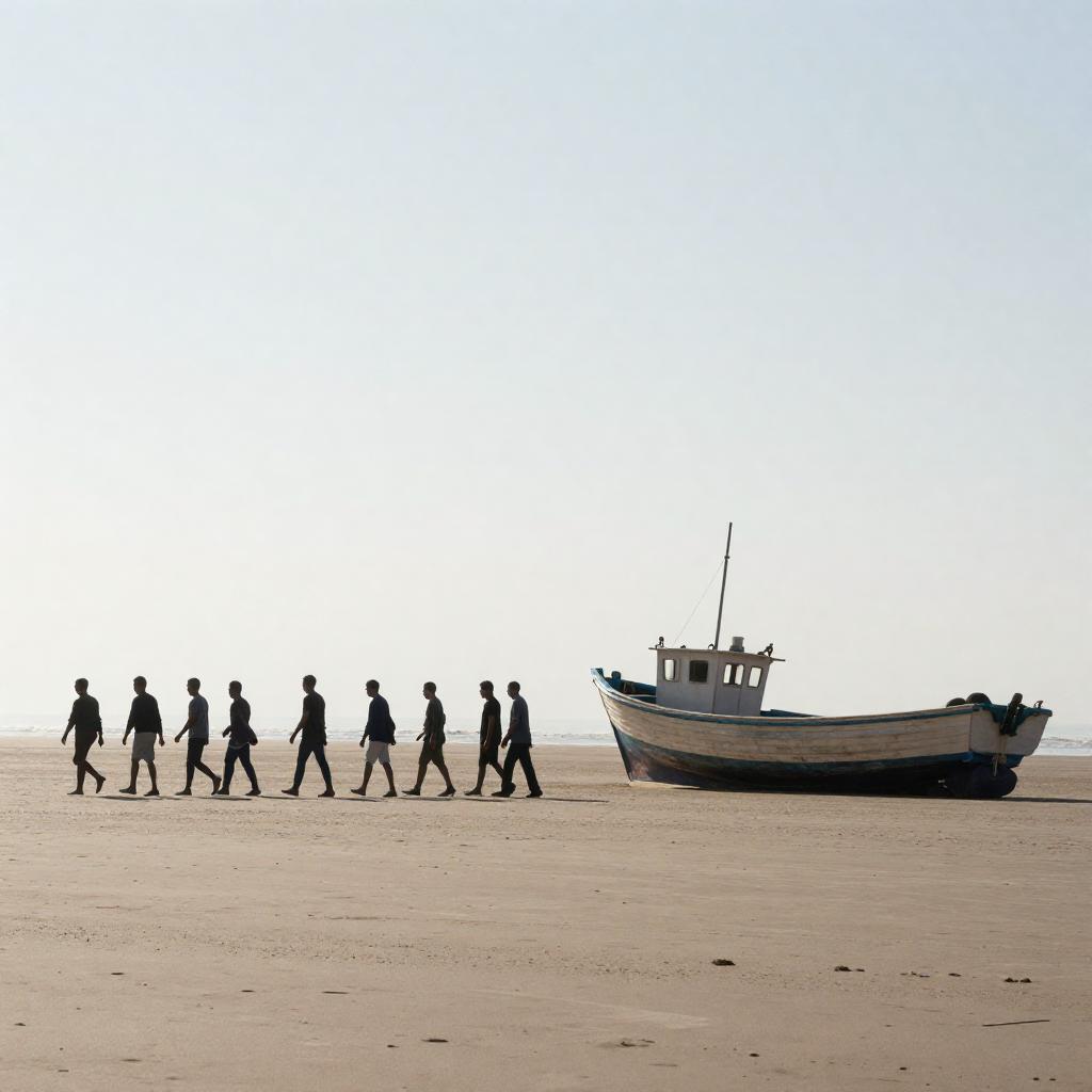 Black-and-white photograph of a large group of people walking along a shoreline, with dark trees in the background and a calm sea in the foreground. The group is positioned to the left, extending towards the horizon. The sky is clear.