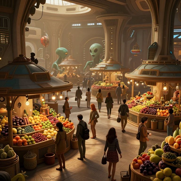 Digital illustration of a futuristic market with alien statues, colorful fruit stalls, and people shopping under warm, glowing lights.
