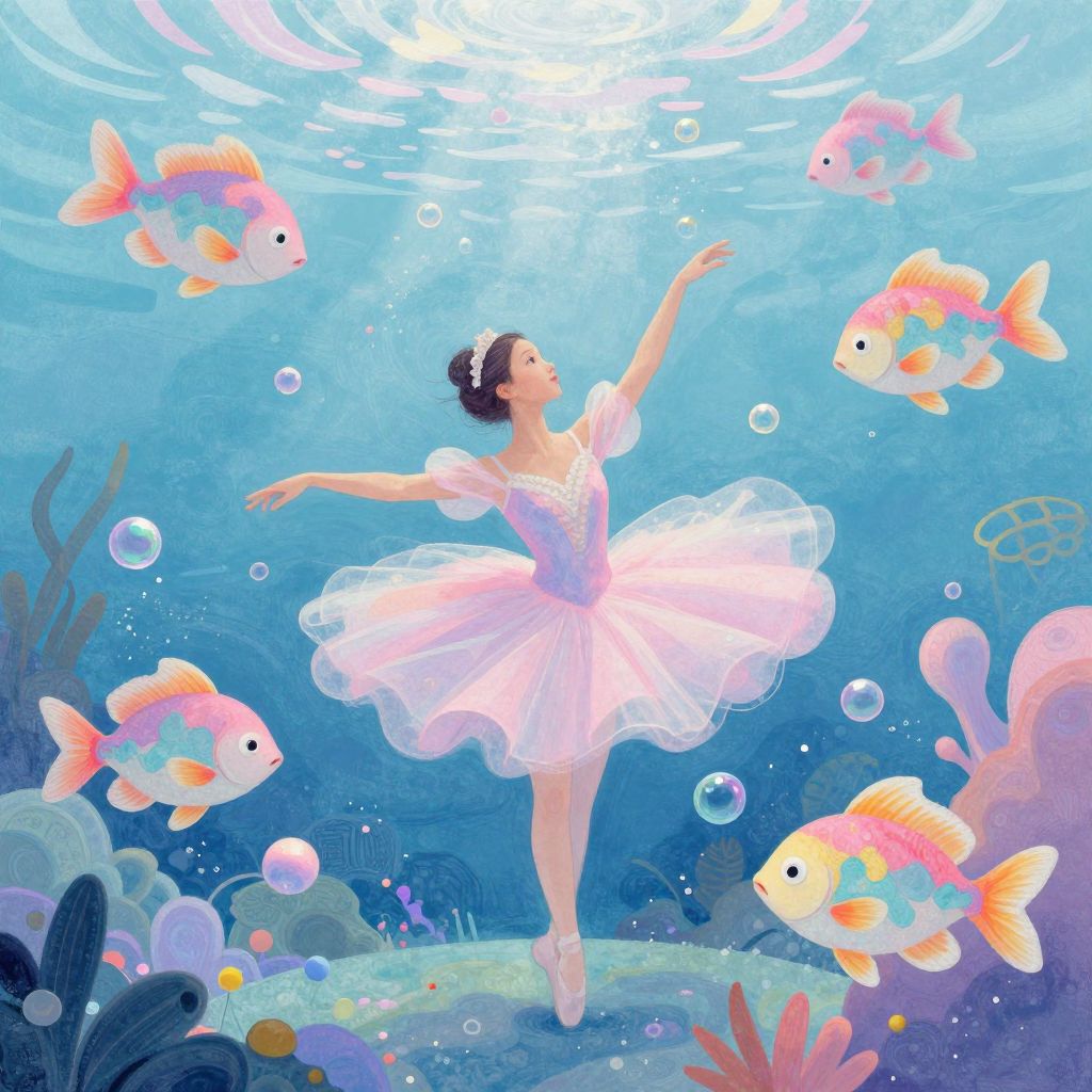 Digital illustration of a ballerina in a pink tutu dancing underwater, surrounded by colorful fish and bubbles, with coral and seaweed in the background