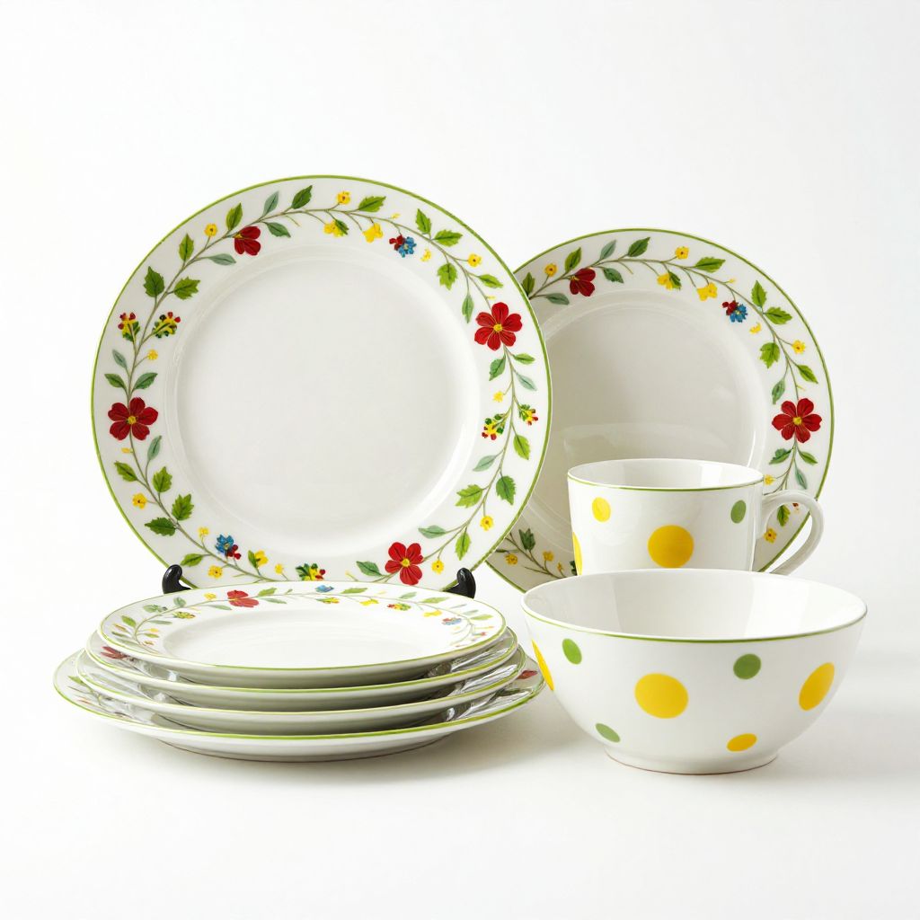 Photograph of a brightly lit, white ceramic dinner set with floral and polka dot patterns. The set includes three large, round, floral-patterned plates with green leaves and red, yellow, and blue flowers, one stacked on top of three others, a large round plate leaning against the stack, a smaller round floral-patterned bowl, and a medium-sized bowl with yellow polka dots. The ceramic pieces have a glossy finish and are arranged against a white background, highlighting their vibrant colors and intricate designs.