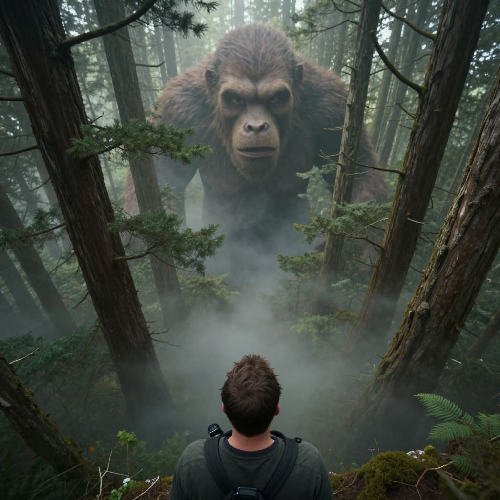 High-angle shot, man's figure dwarfed by towering trees, eerie mist swirling around him, eyes fixed on massive, hairy creature emerging from depths of dense forest, branches creaking ominously, camera positioned to emphasize sense of wonder, fear, and discovery, soft focus, muted colors, cinematic feel. Man has masculine face and piercing eyes