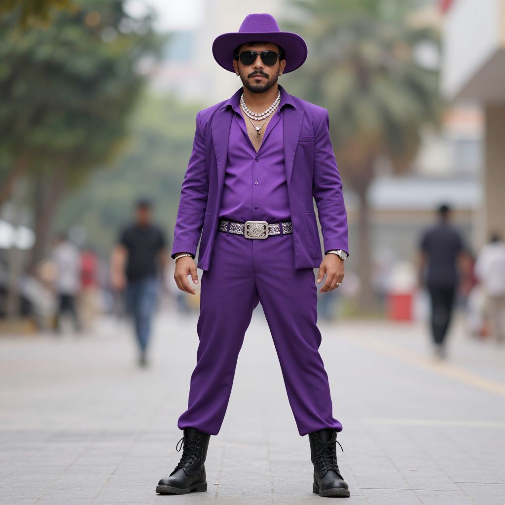 Photograph of a bearded man in a vibrant purple suit, wide-brimmed hat, sunglasses, gold necklace, and black boots, standing confidently