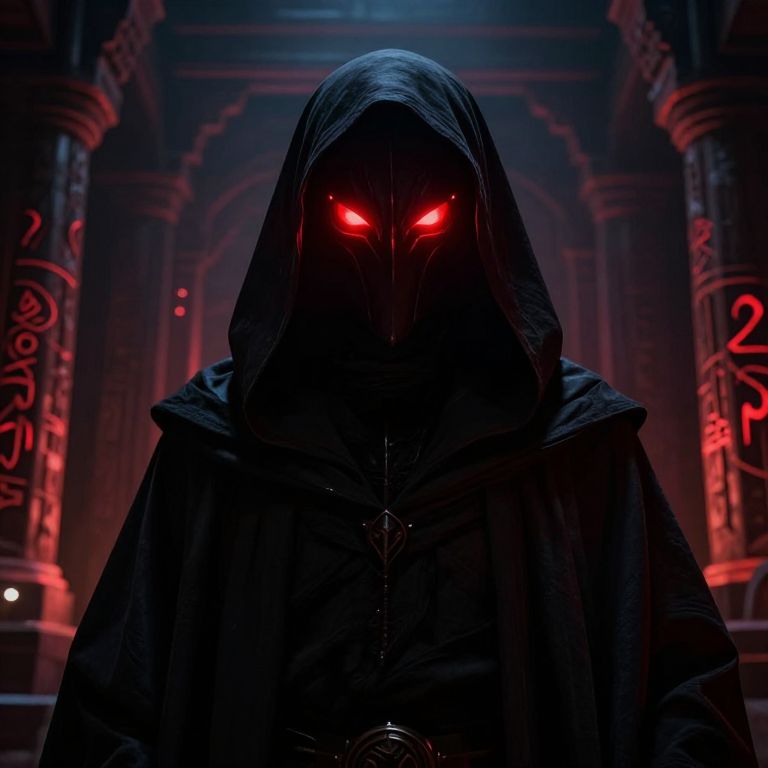 Glowing Sith eyes blazing brightly atop a mysterious figure cloaked in shadow, their crimson gaze cutting through the darkness in a foreboding ancient temple with arcane symbols glowing faintly in the background, creating a haunting and powerful atmosphere.