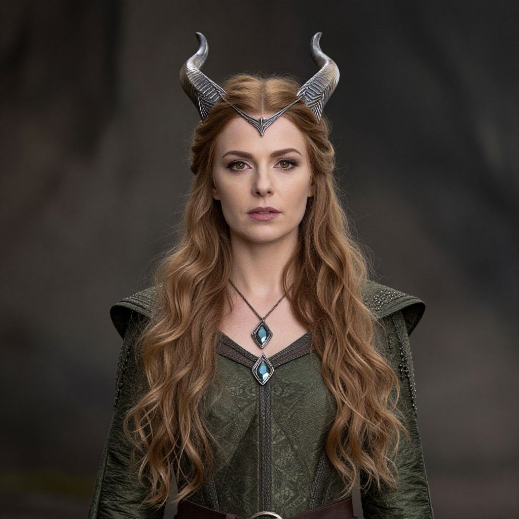 "Woman Lord Rings Elf, a woman with long hair and a horned headdress posing for a photo"