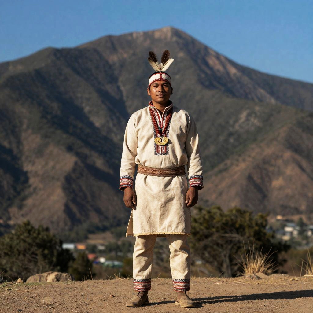 Indigenous Costume Male, man in native clothing standing in front of a mountain