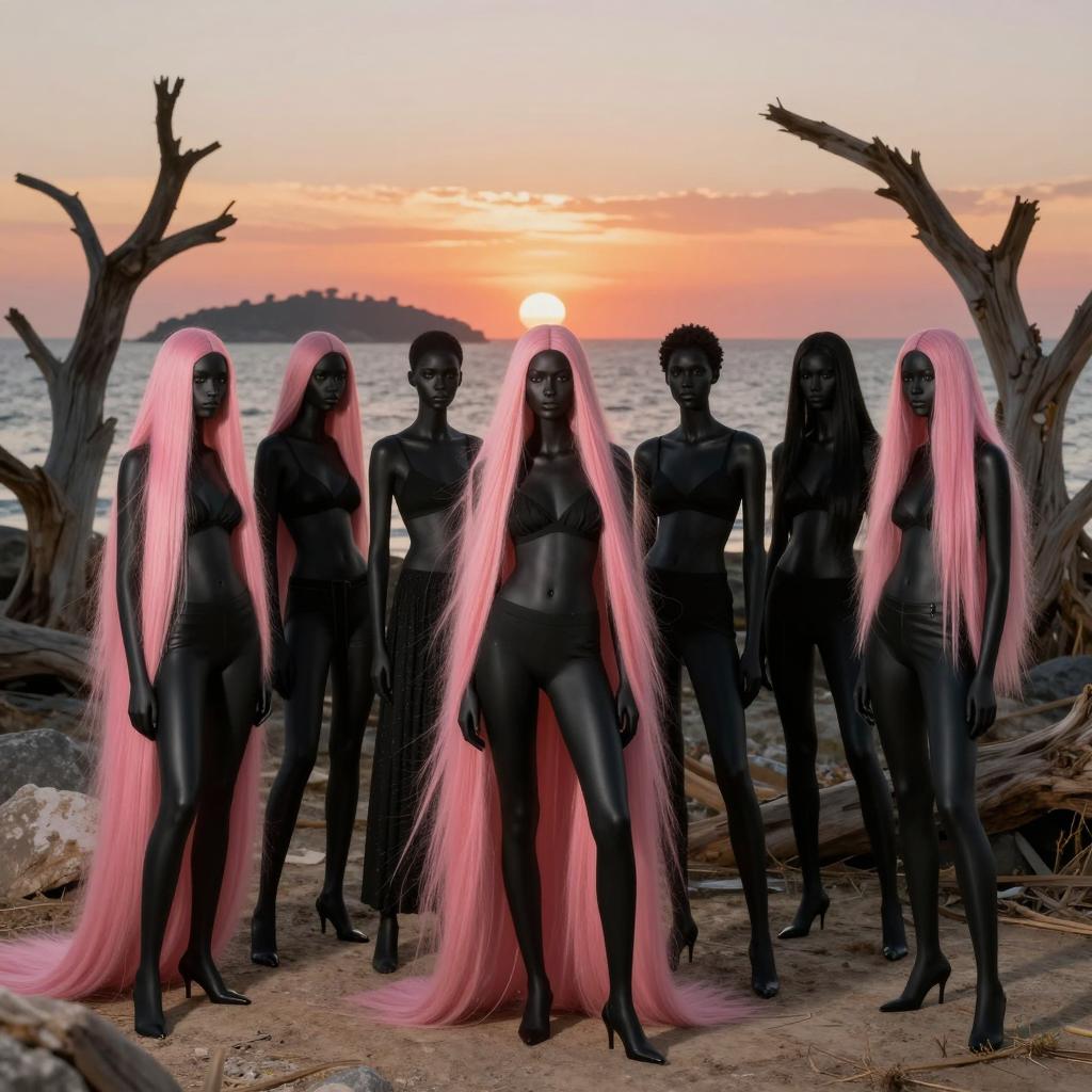 Architectural Art / six black models hyper realistic, with super super long pink hair, in a old painting over the sea, with old dry trees in the backround, in a orange golden sunset on Island , in the style of Martin Parr and Paolo Roversi, with clothes by Jacquemus future collection on Portra 400, f4. 8 aperture, 8k,