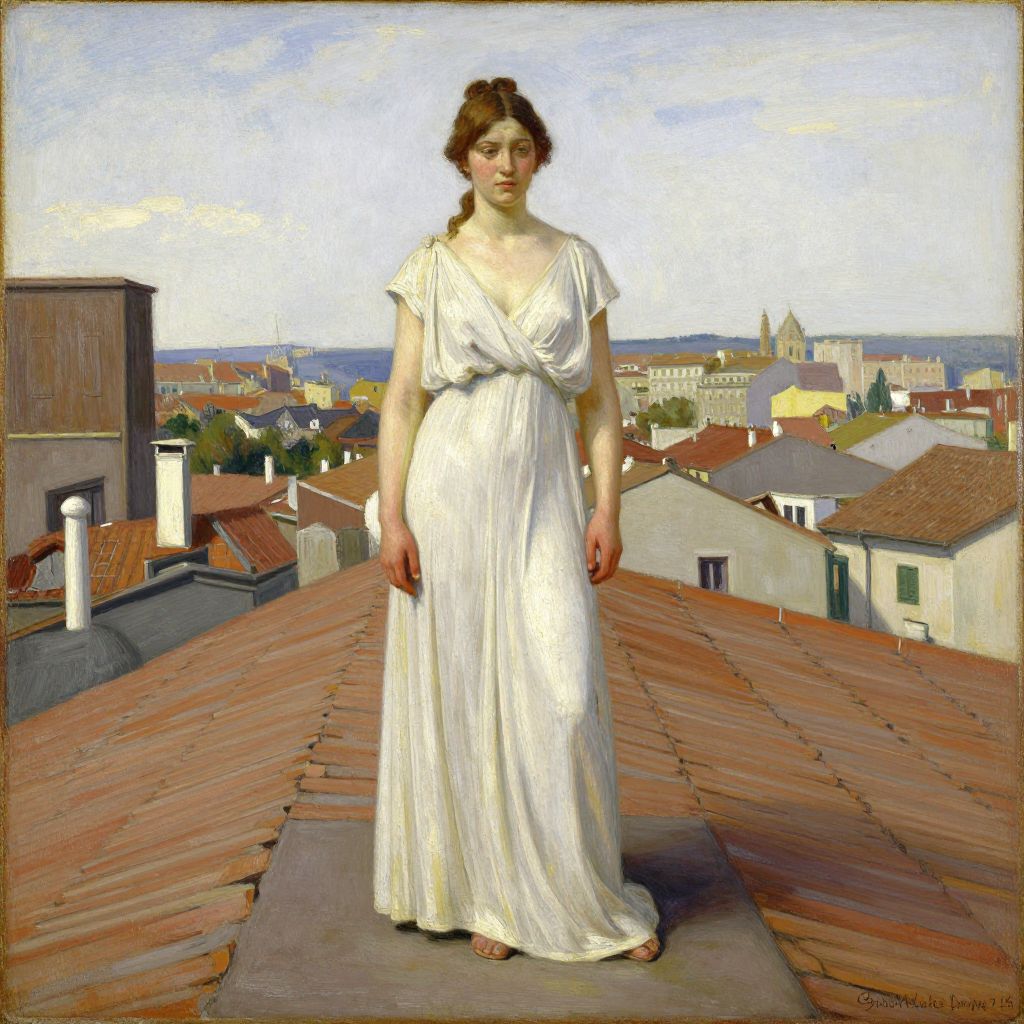 Photorealistic painting of a fair-skinned woman with brown hair in a white, pleated gown, standing on a tiled rooftop with a town and