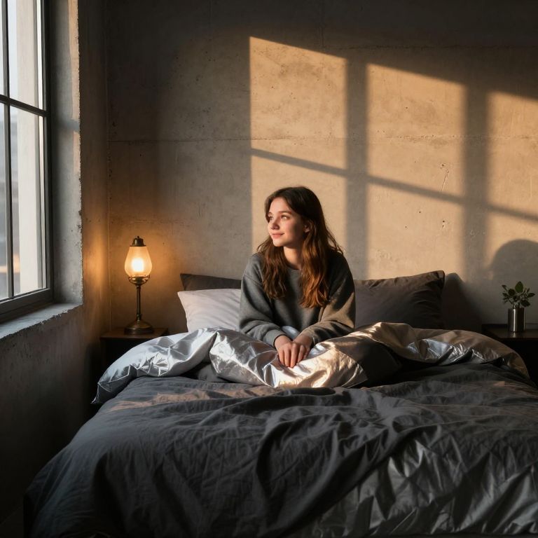 Photograph of a young woman with long, wavy brown hair and fair skin, sitting on a bed in a dimly lit room. She wears a gray, long-sleeved sweater and gazes out a large window on the left, where sunlight casts strong shadows on the concrete wall behind her. The bed has dark gray sheets and a silver-colored blanket partially covering her. A small, warm-glowing lamp on a nightstand to the left of the bed adds soft light. A small potted plant sits on the nightstand, adding a touch of greenery. The room has a minimalist, industrial style.