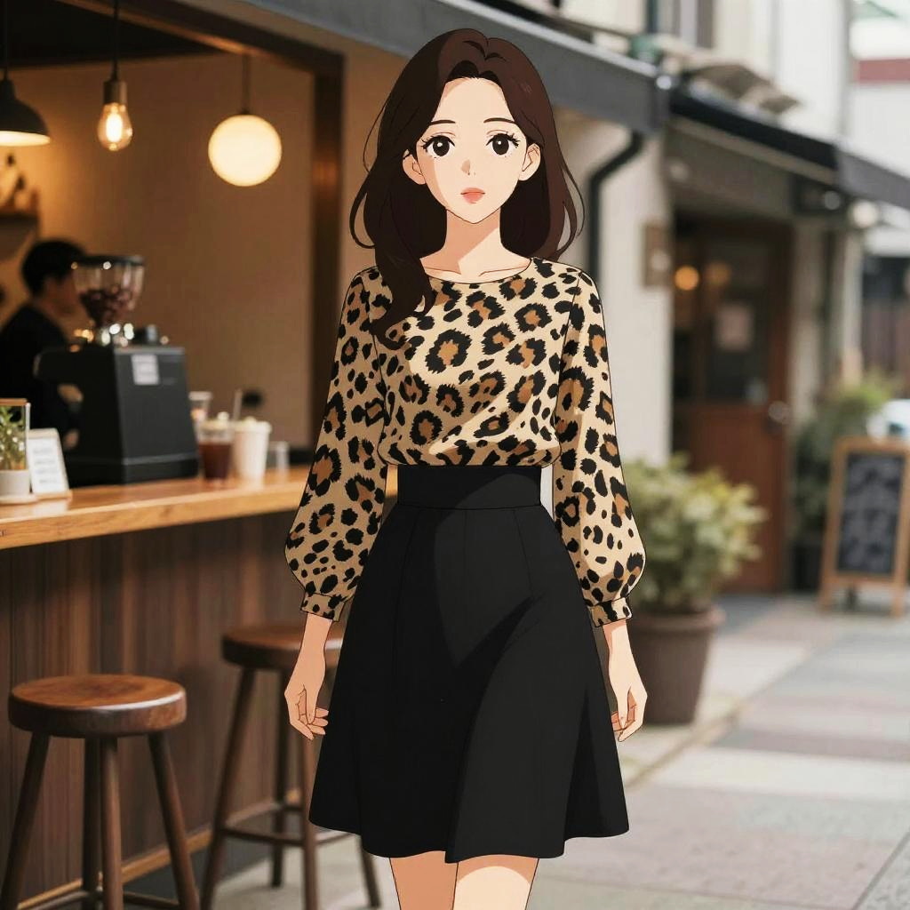 A woman in a contemporary chic style, wearing a black and beige animal print top with long sleeves and a high-waisted A-line black skirt, standing in a trendy coffee bar in a cozy alleyway, illustrated in the visual style of Kyoto Animation. Sexy. Pretty face and beutiful eyes