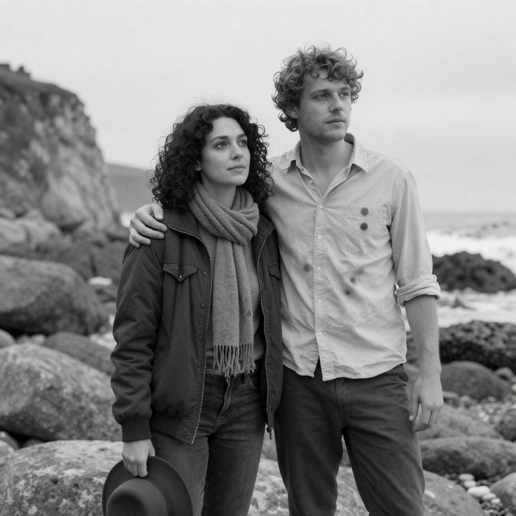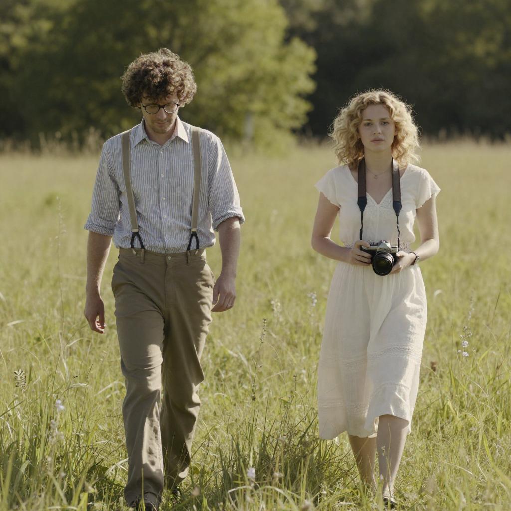 Black-and-white photograph of two people walking through tall grass. Man on left wears striped shirt, suspenders, and glasses, looking down. Woman on right has curly hair, long dress, and holds a book. Sunlight casts shadows on their faces. Woman's dress billows slightly. Both walk forward, man slightly behind woman. Dense grass surrounds them.