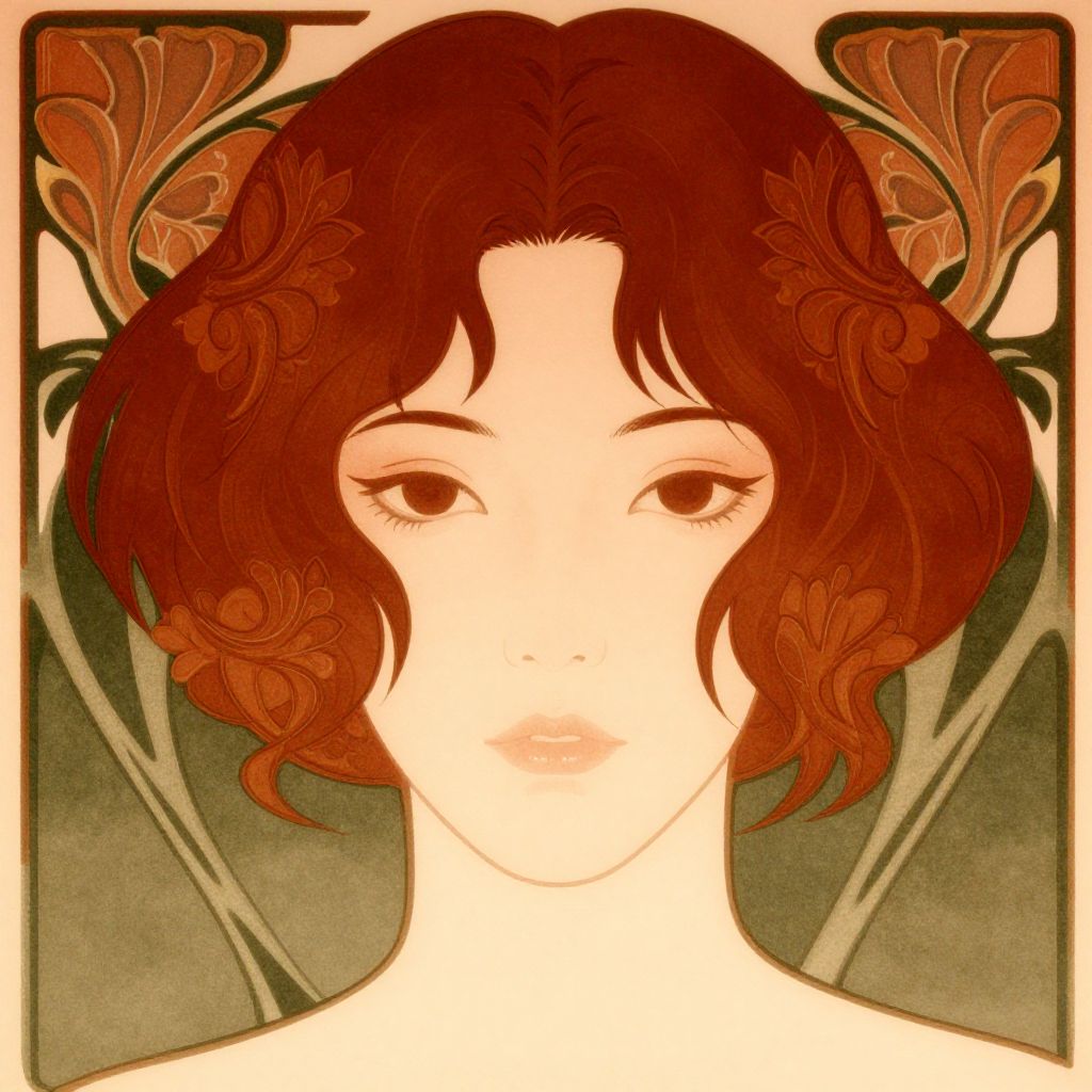 Portrait of a person with dark red hair in a modern art nouveau style, intricate floral patterns framing the face, warm reds and deep greens, stylized but detailed, elegant and refined, soft pastel background