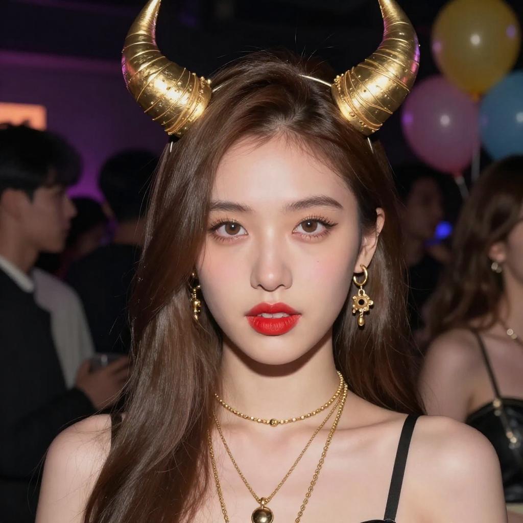 Close-up of a young woman with long brown hair and brown eyes wearing gold horn accessories and multiple necklaces at a crowded costume party. She has bright red lipstick, gold earrings, and is dressed in a black outfit. The background features blurred party attendees and colorful balloons.