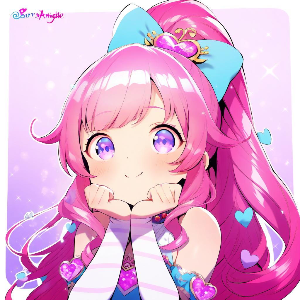 Momoyama mirai, pretty series, 1girl, blue eyes, purple eyes, pink hair, long hair, sidelocks, ponytail, high ponytail, hair bow, by artist born-to-die, animagine