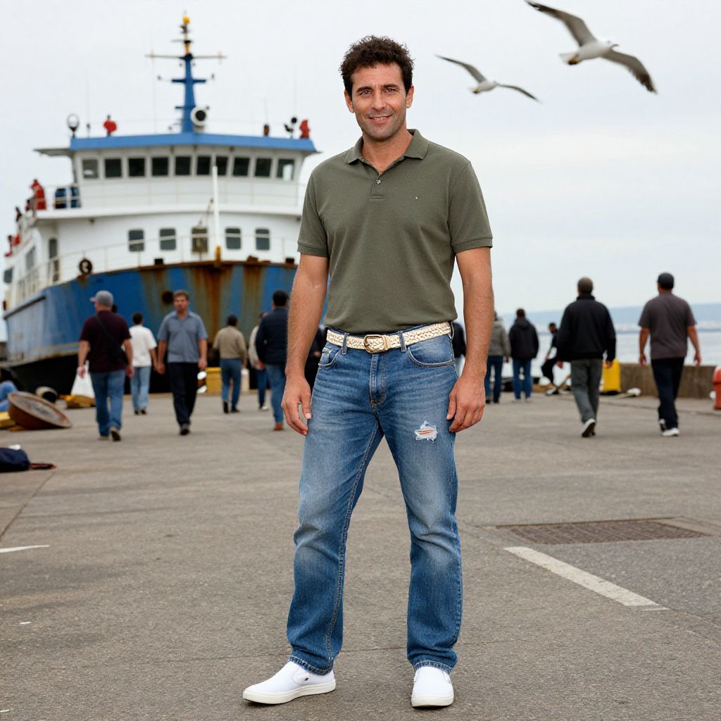 A man, olive green polo shirt, distressed blue jeans, white canvas slip-ons, braided leather belt, lightweight cotton, bustling dockside, rusty blue ferry, eastman film stock, relaxed smile, seagulls soaring overhead. Man has masculine face and piercing eyes
