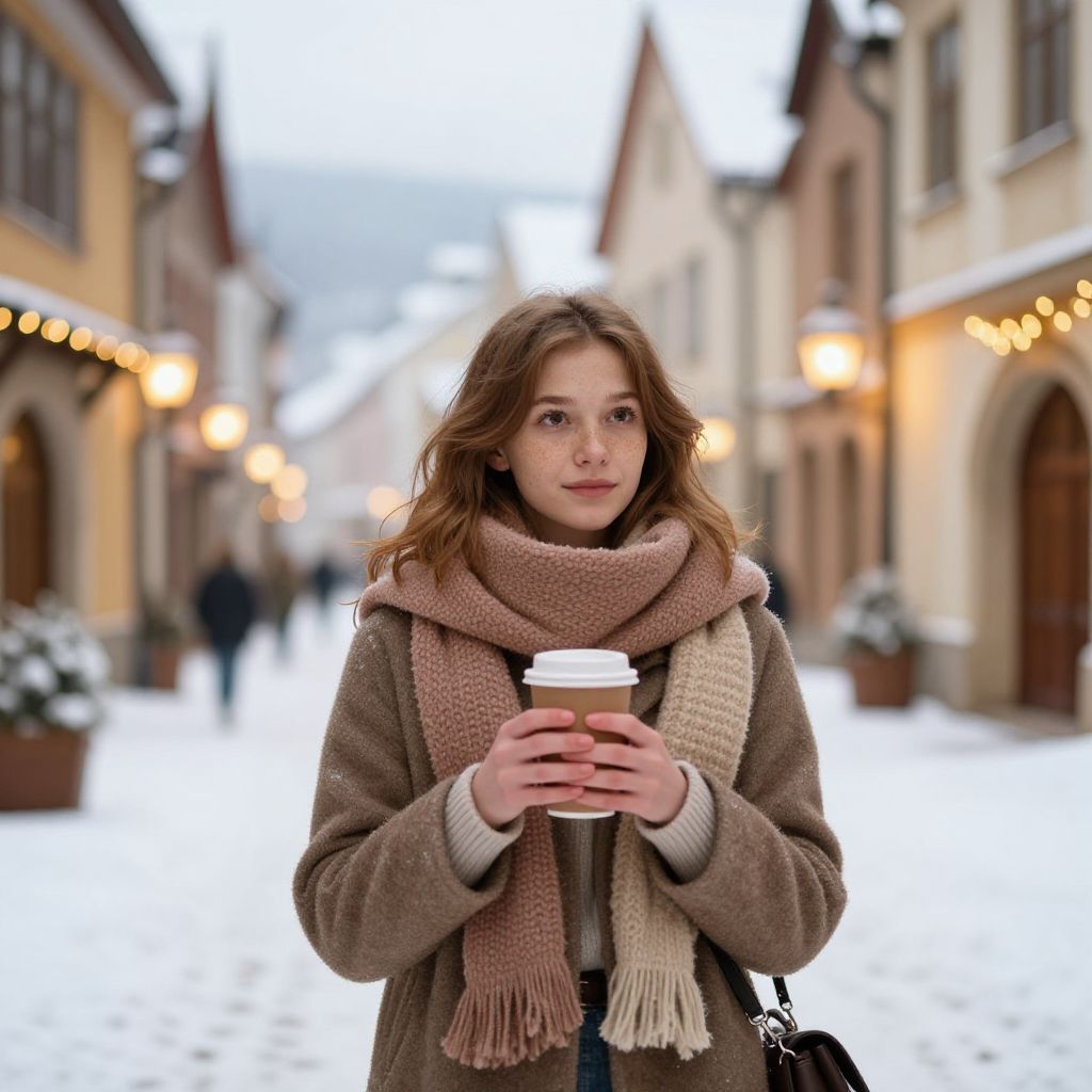 Photograph of a young Caucasian woman with wavy brown hair standing in a snowy, cobblestone street lined with illuminated buildings. She wears a brown wool coat, a beige and pink knitted scarf, and holds a paper coffee cup with a white lid. Her expression is neutral. The background features blurred, warmly lit storefronts with string lights and snow-covered ground, creating a cozy winter atmosphere. The sky is overcast, adding a soft, diffused light to the scene. The woman is centered in the frame, looking directly at the camera.