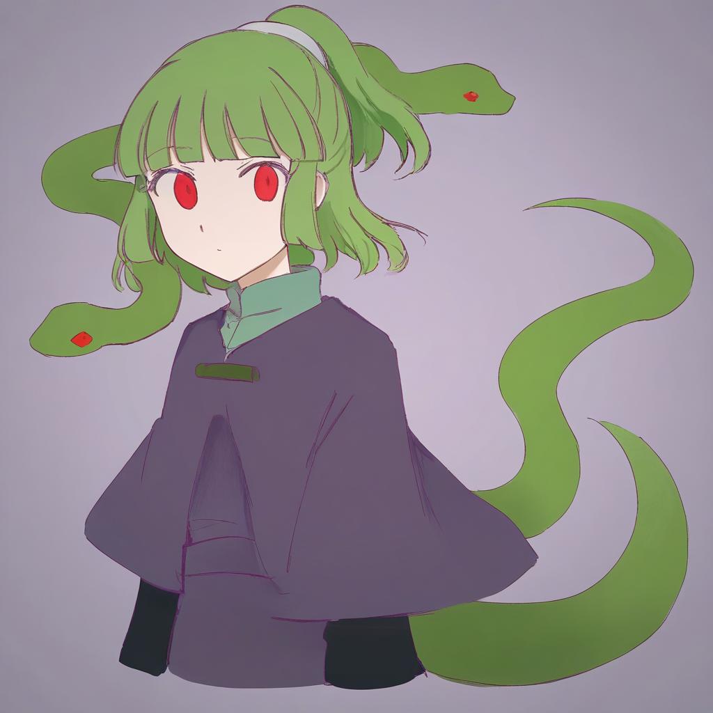 Adagumo no saragimaru, len'en, 1other, snake tail, red eyes, green hair, short hair, snake hair ornament, short ponytail, split ponytail, blunt bangs, ponytail, purple capelet, japanese clothes, long sleeves, wide sleeves, black sleeves, by artist sbs, leet