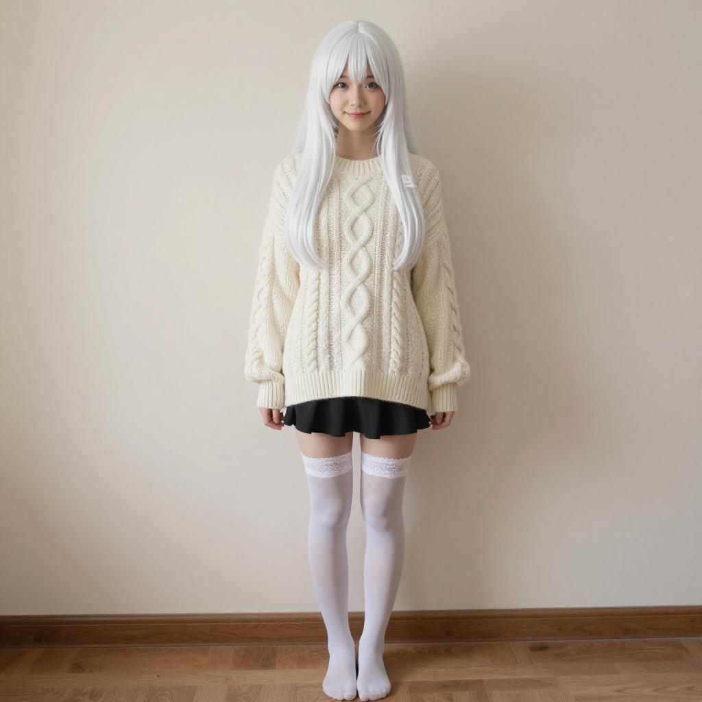 This digital image features a cute, young woman with long, straight white hair, fair skin, and blue eyes. She's wearing a cream cable-knit sweater, a short black skirt, and white lace-top thigh-high stockings. She's standing barefoot on a wooden floor against a beige wall, casting a soft shadow. She's smiling gently and looking at the camera. The room has a simple, clean look.