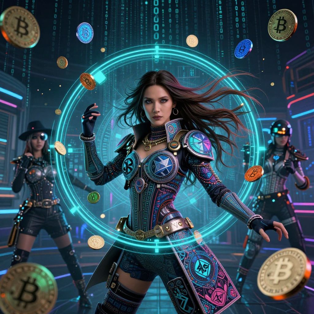 The image depicts a cyberpunk scene with a futuristic, high-tech aesthetic. At the center, a woman with long, flowing hair is prominently featured, wearing a detailed, intricate outfit adorned with various symbols and patterns. She is surrounded by a thin cyan magic circle, from which multiple cryptocurrency coins are falling. These coins are depicted in a variety of colors, including shades of blue, green, and orange, and are scattered around the circle. In the background, two other women are visible, one wearing a hat and the other with a helmet, both seemingly engaged in an activity related to the coins. The overall composition is dynamic, with the coins creating a sense of motion and the women appearing to interact with them. The background is filled with binary code patterns and other digital elements, enhancing the cyberpunk theme. The scene is rich in detail, with textures ranging from the smooth surfaces of the coins to the intricate patterns on the women's clothing.