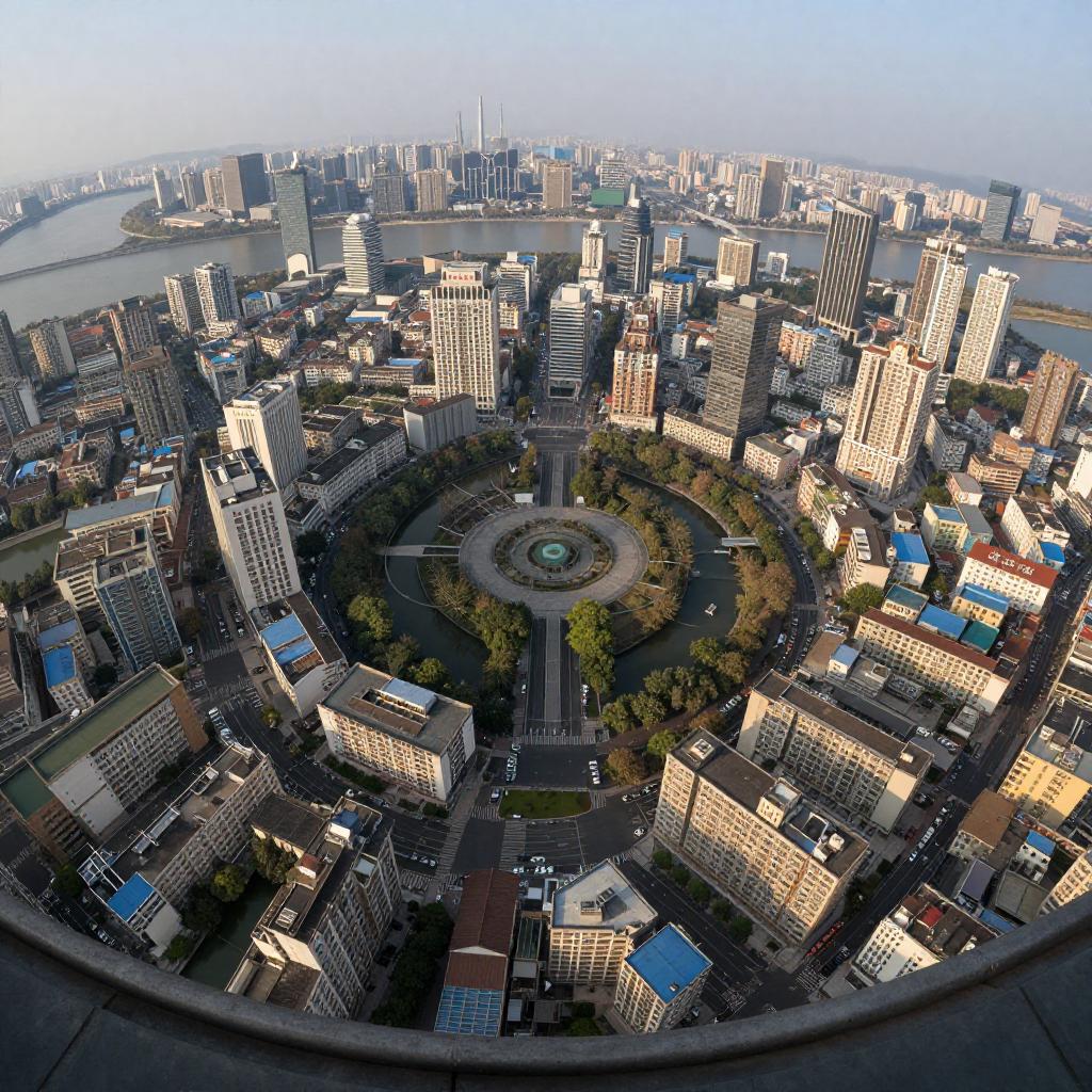 Aerial photograph of a bustling cityscape at dusk, with a deep blue sky transitioning to night. Tall, modern skyscrapers with illuminated windows line the left side, while light trails from moving vehicles create a vibrant, orange glow on the busy highway below. The camera angle is slightly elevated, capturing the city's grid-like pattern. The foreground is sharp, while the distant background is softly blurred, adding depth. Lighting is artificial, highlighting the city's energy.