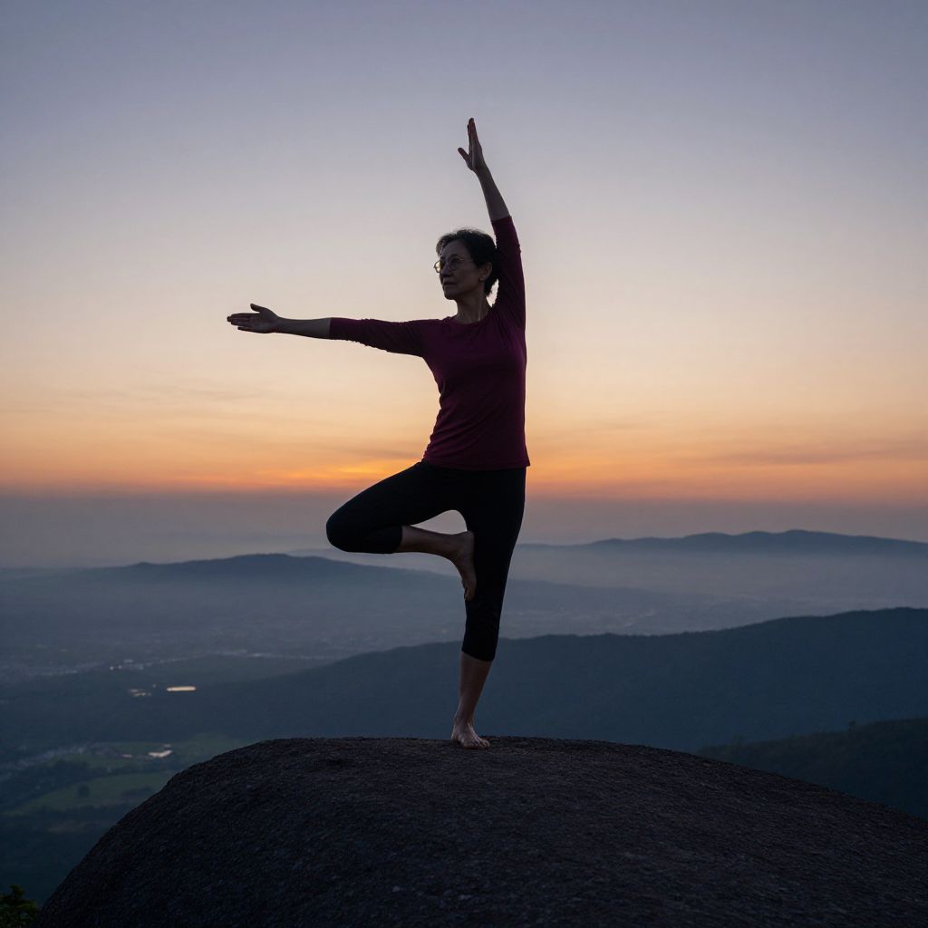 Photograph of a blonde woman in a sports bra and leggings, meditating in lotus position on a rocky mountain ledge at sunset, with rolling hills
