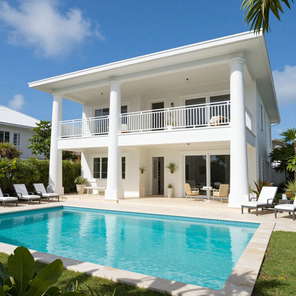 Photograph of a white, two-story house with balconies on a lake, surrounded by trees, with calm water reflecting the house.