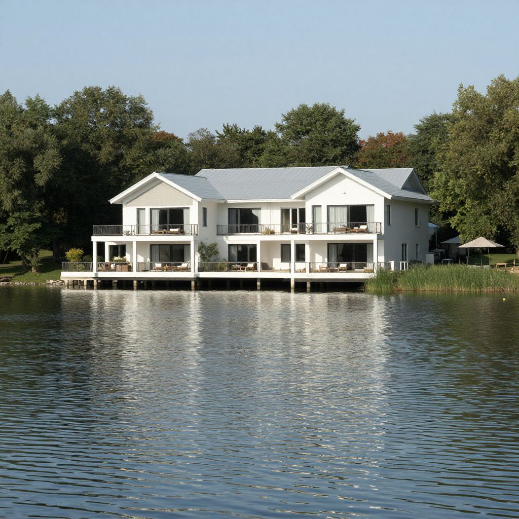 Photograph of a two-story, white modern house with a silver roof, situated on a wooden dock over a calm, reflective lake. The house features multiple balconies with black railings, and large windows. Surrounding the house are lush, green trees and tall grass near the water's edge. The sky is clear and blue, suggesting a sunny day. The water in the foreground is still, with gentle ripples reflecting the house and sky. The overall scene is serene and picturesque, with the house centered in the image.