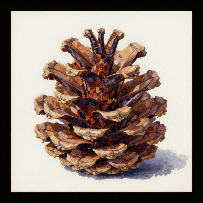 Watercolor painting of a detailed, brown pine cone with dark brown scales, centered against a white background, framed in black.