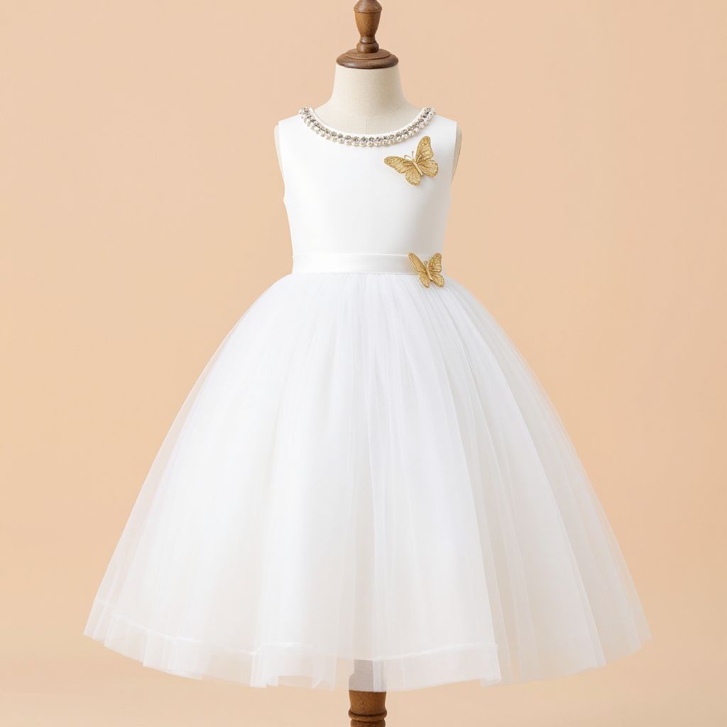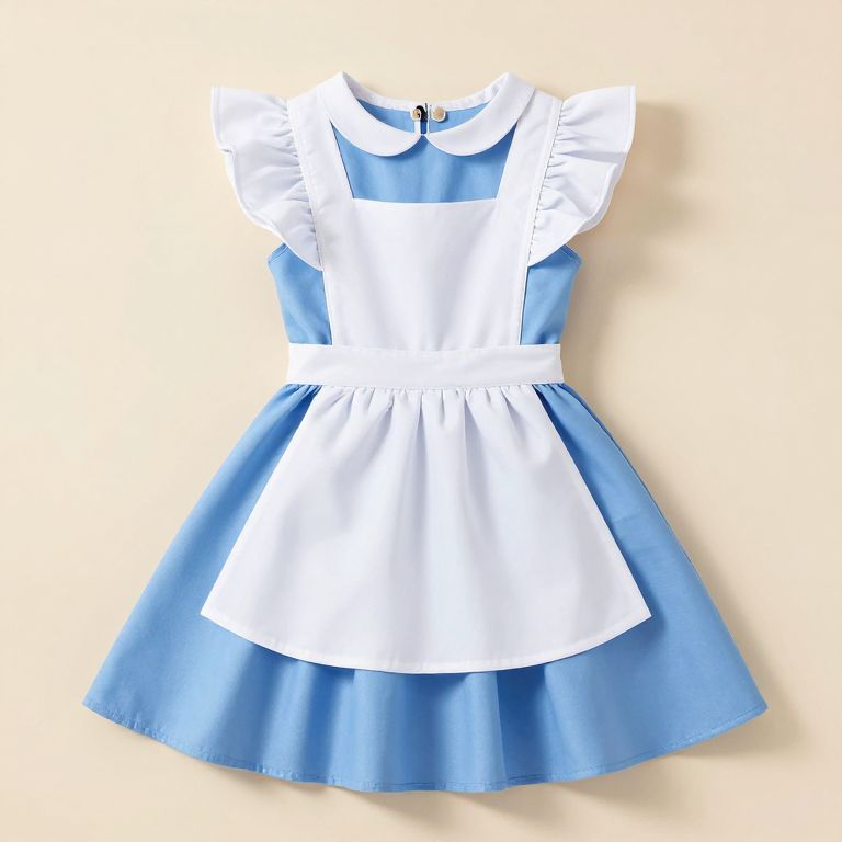 Elegant princess costume featuring a light blue, tiered tulle skirt with scalloped lace trim, a sheer lace bodice adorned with butterfly patterns and a central blue flower, and shoulder straps with matching fabric puffs, designed for pretend-play as Cinderella.